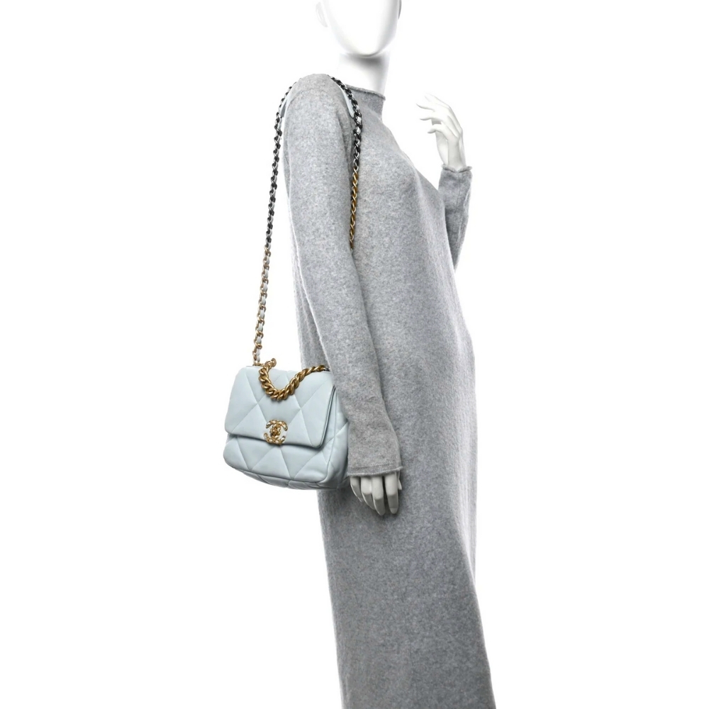 The Chanel 19 Flap Bag in light blue is a modern icon that blends the Maison’s heritage with a relaxed, slouchy aesthetic. Designed for multiple carrying options, it can be held by the top handle, worn on the shoulder, or styled as a crossbody for a contemporary look.