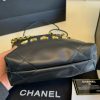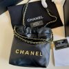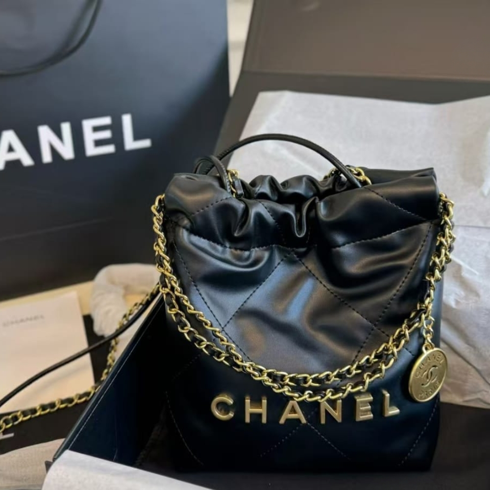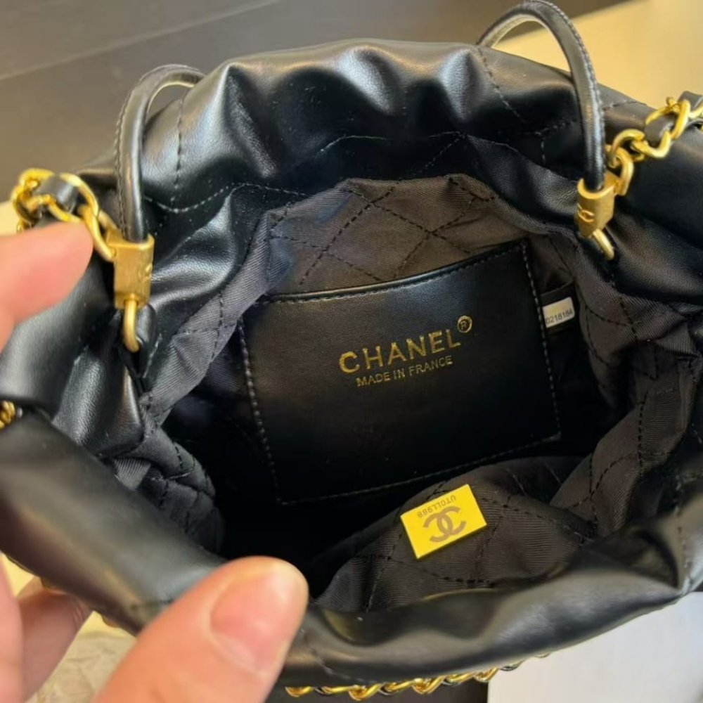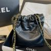 The Chanel 22 Mini Handbag in black is a modern, hobo-style accessory crafted from Glossy leather and accented with radiant gold-tone hardware. Its versatile design includes two classic leather-interlaced chain handles and a long shoulder strap, allowing for effortless hand, shoulder, or crossbody carry. The interior is lined with quilted fabric and includes a practical flat pocket, making it a stylish yet functional staple for any high-end collection.