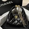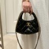 The Chanel 24A Small Hobo Bag in black, featuring shiny leather and gold-tone metal accents. It has the classic quilted design and the iconic Chanel logo on the front. The size is 20cm, and it comes with a chain strap for easy carrying.