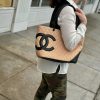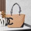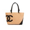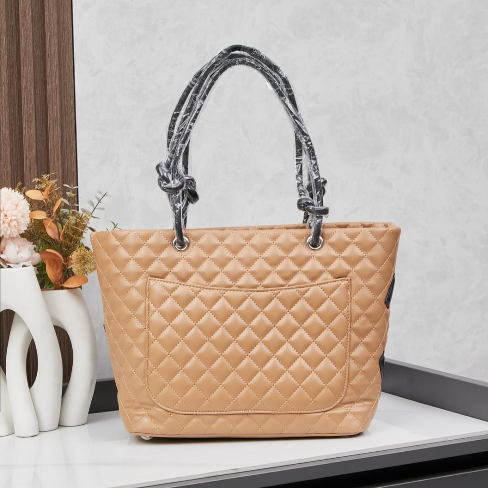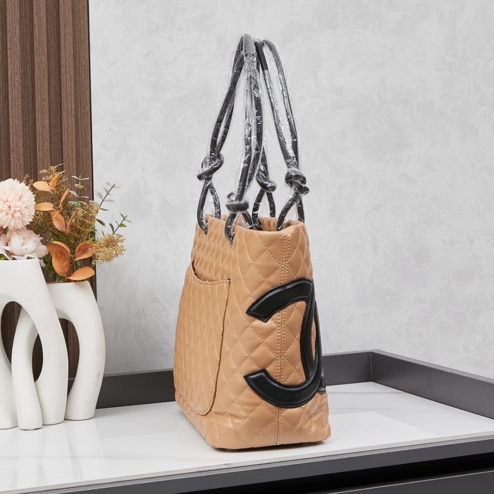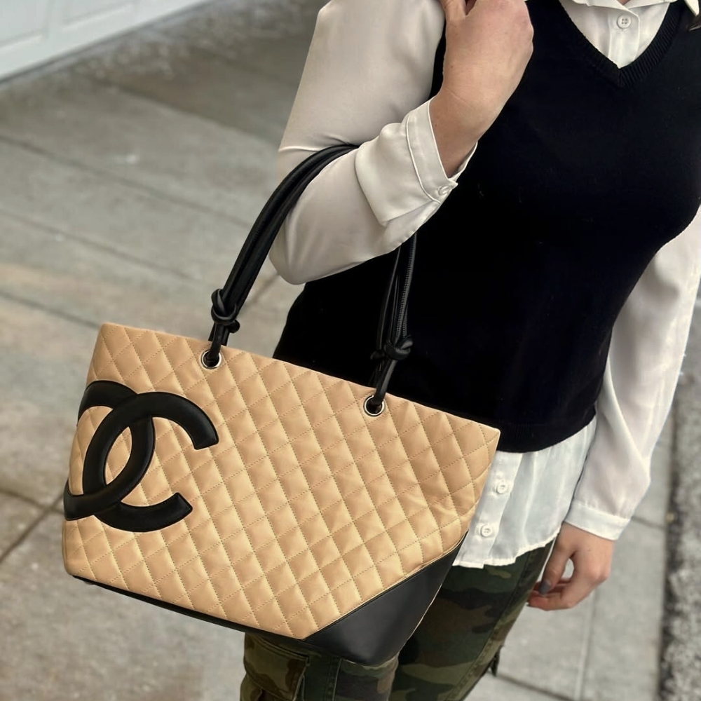 This Chanel Cambon Line Medium Tote Bag is crafted from quilted leather in a crisp beige and black contrast, highlighted by the bold oversized CC logo. Sized at 28cm, it offers a spacious interior ideal for daily use, work. A timeless luxury tote that blends practicality with iconic Chanel style.