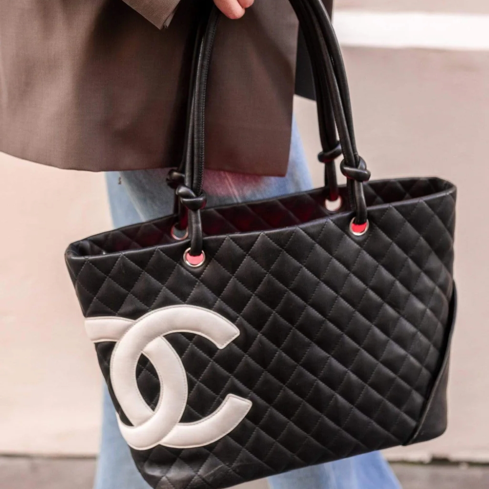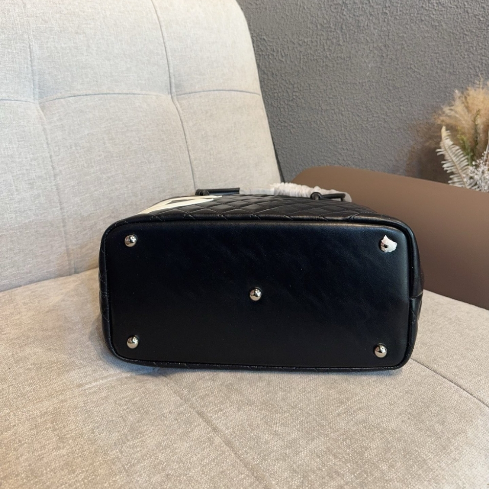 This Chanel Cambon Line Medium Tote Bag is crafted from quilted leather in a crisp black and white contrast, highlighted by the bold oversized CC logo. Sized at 28cm, it offers a spacious interior ideal for daily use, work. A timeless luxury tote that blends practicality with iconic Chanel style.