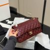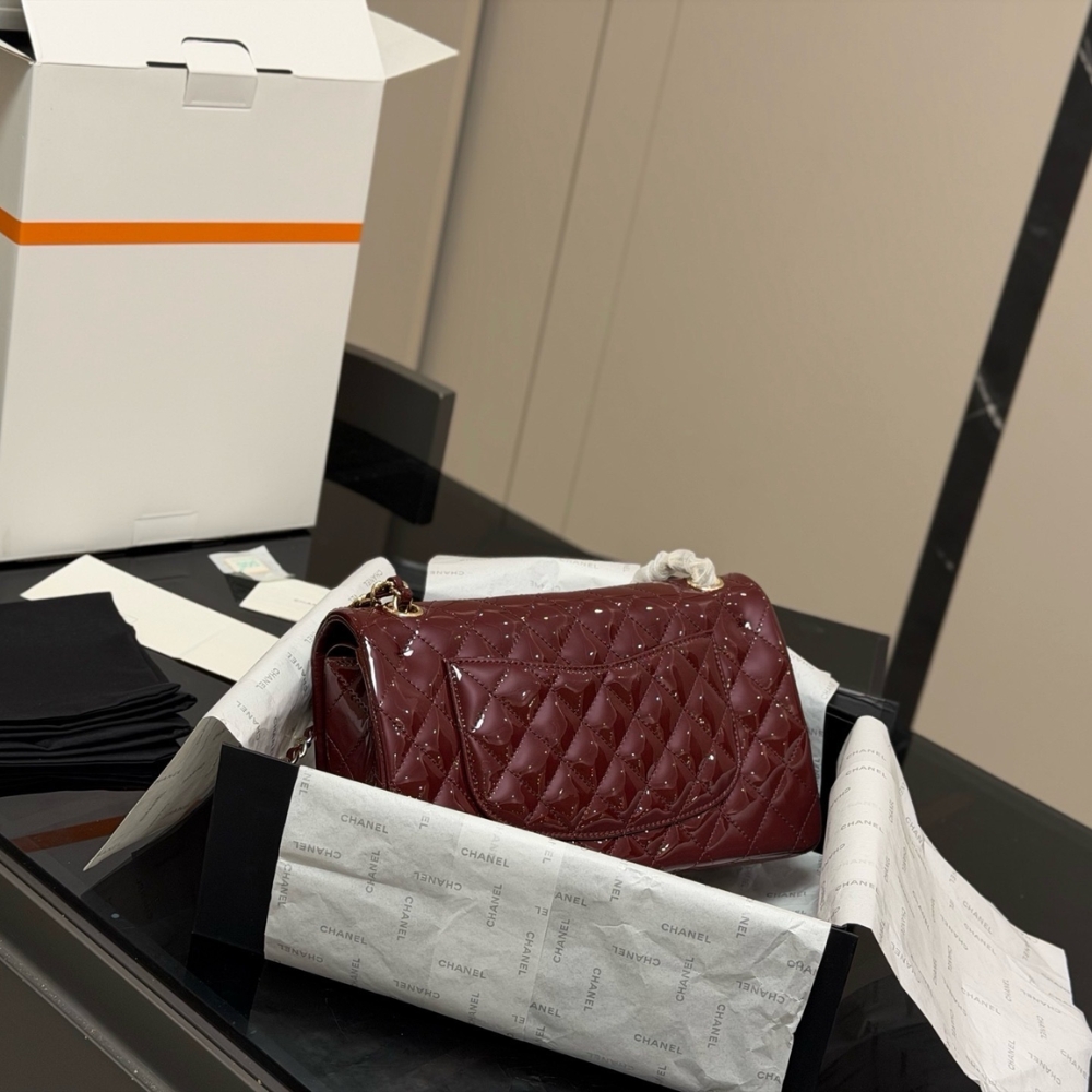 The Chanel Medium Classic Double Flap Bag in burgundy patent leather is a timeless icon of elegance. Its glossy finish enhances the signature quilting, while the gold-tone CC turn-lock and chain-link shoulder strap add a luxurious touch. Featuring a structured double-flap design for extra security and organization, this bag is a perfect blend of style and function, ideal for any occasion.