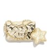 The Chanel Mini Flap Bag in metallic yellow gold features a high-shine mirror finish and iconic diamond quilting, accompanied by a charming detachable star-shaped coin purse for a stylish and whimsical touch.
