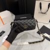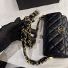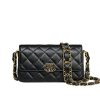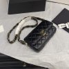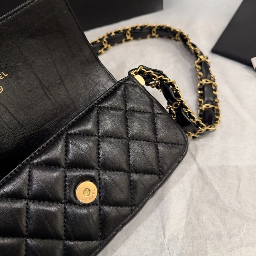 The Chanel Phone Holder with Chain in aged leather, featuring a luxurious quilted design in white. It is adorned with the signature gold-tone Chanel logo on the front and a gold-tone chain strap for easy carrying. With a compact size of 18cm, this stylish and functional piece is perfect for holding your phone and small essentials for a night out or casual day.