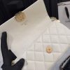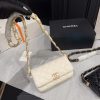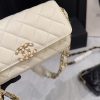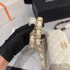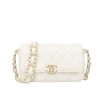 The Chanel Phone Holder with Chain in aged leather, featuring a luxurious quilted design in white. It is adorned with the signature gold-tone Chanel logo on the front and a gold-tone chain strap for easy carrying. With a compact size of 18cm, this stylish and functional piece is perfect for holding your phone and small essentials for a night out or casual day.