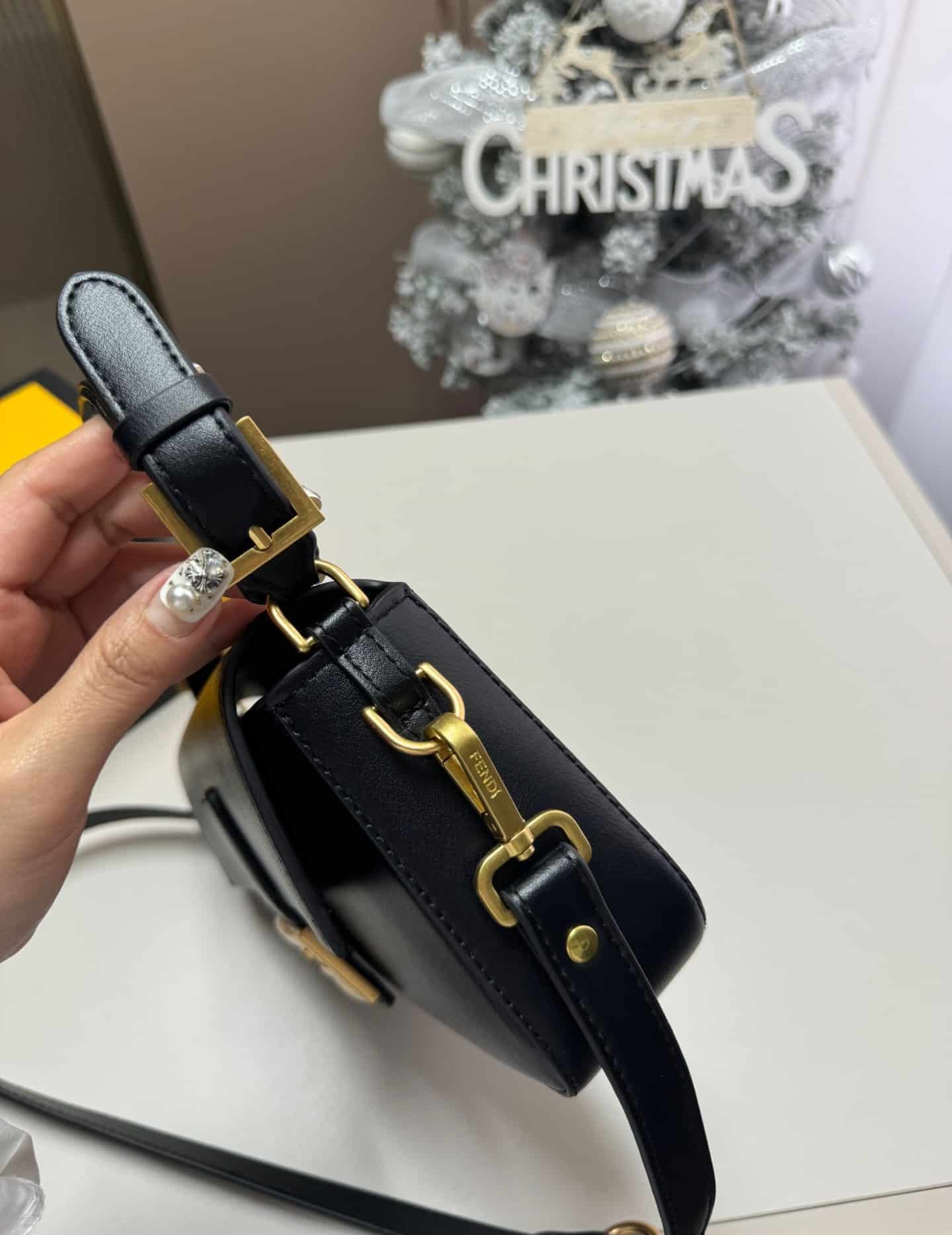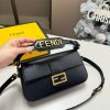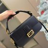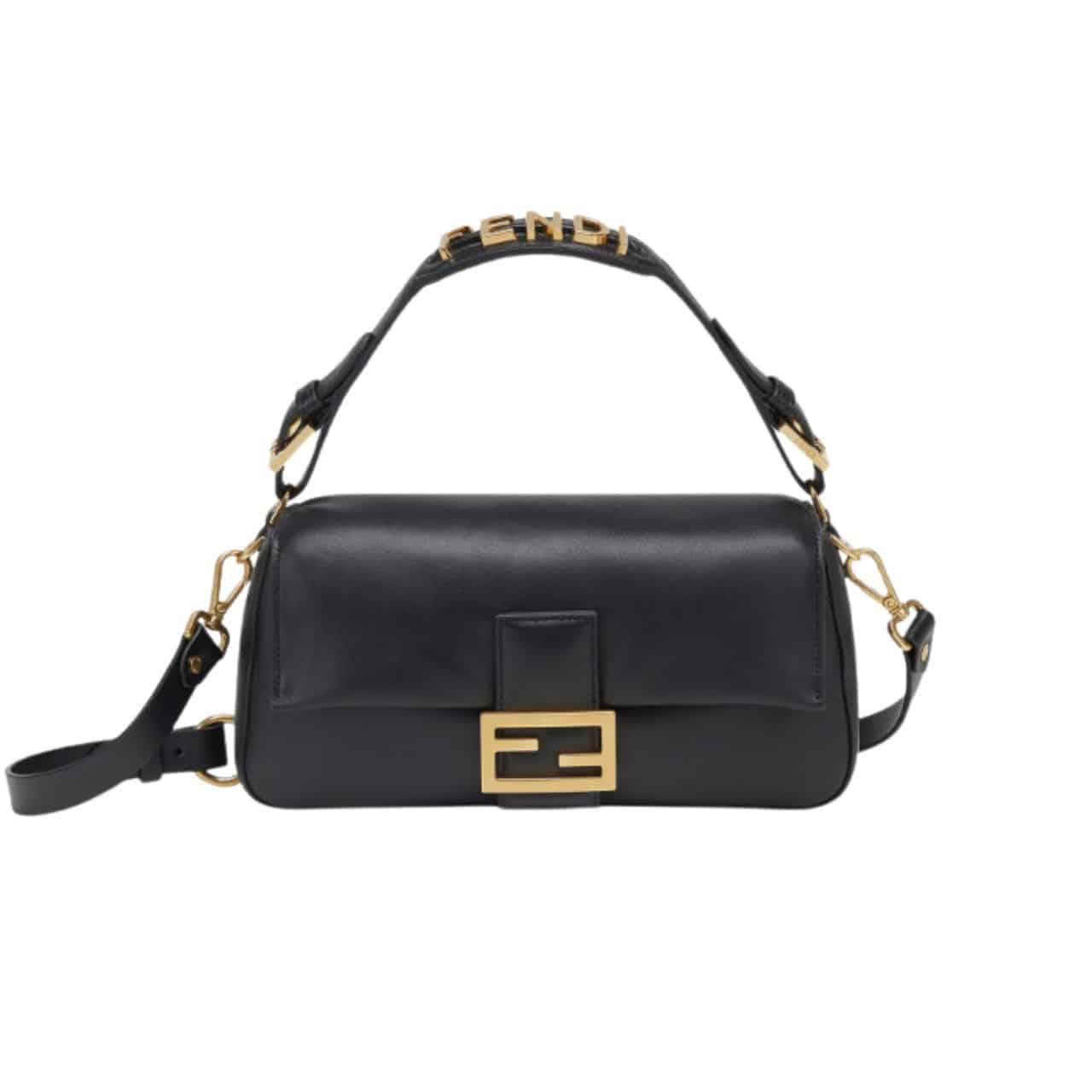 - Embellished with a handle with metal FENDI lettering that can be hooked either to the bag or to the shoulder strap