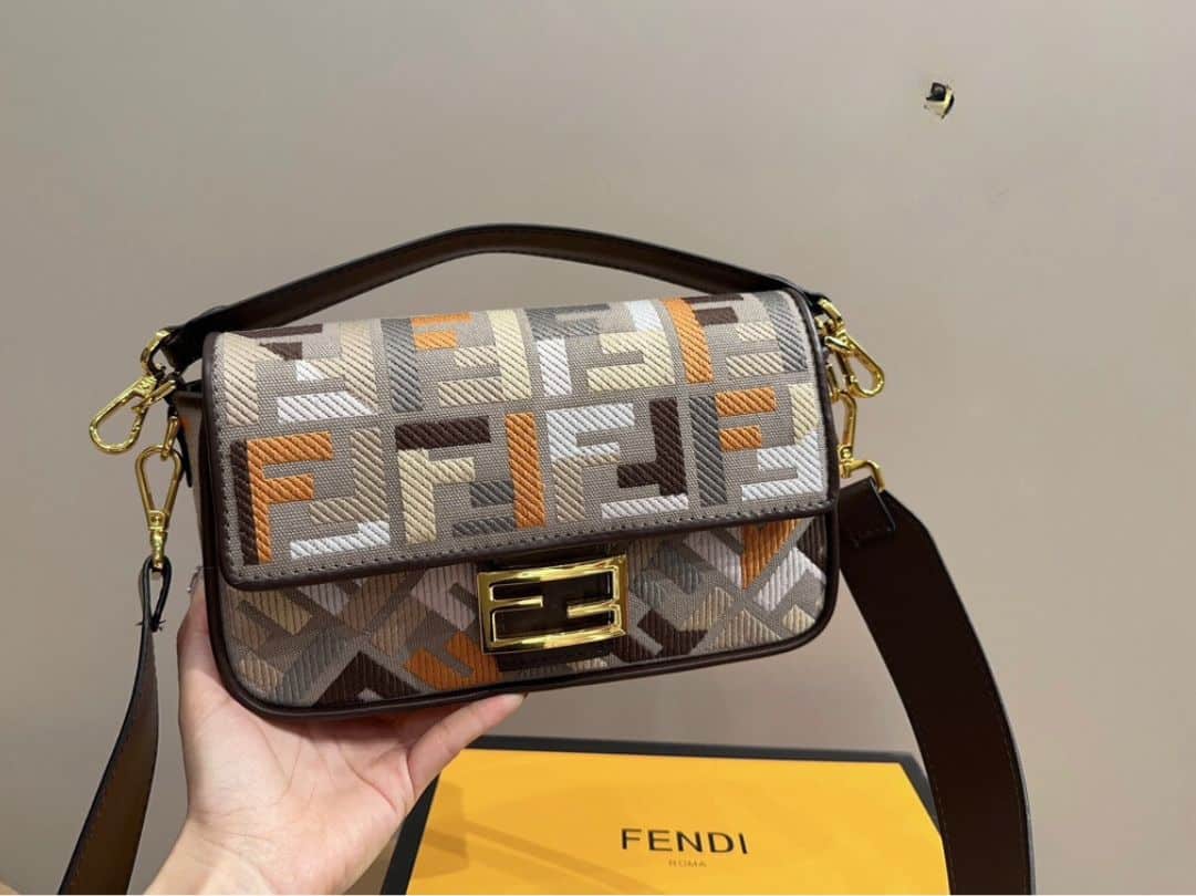 - Gray canvas with a raised FF motif embroidered in multicolor yarn.