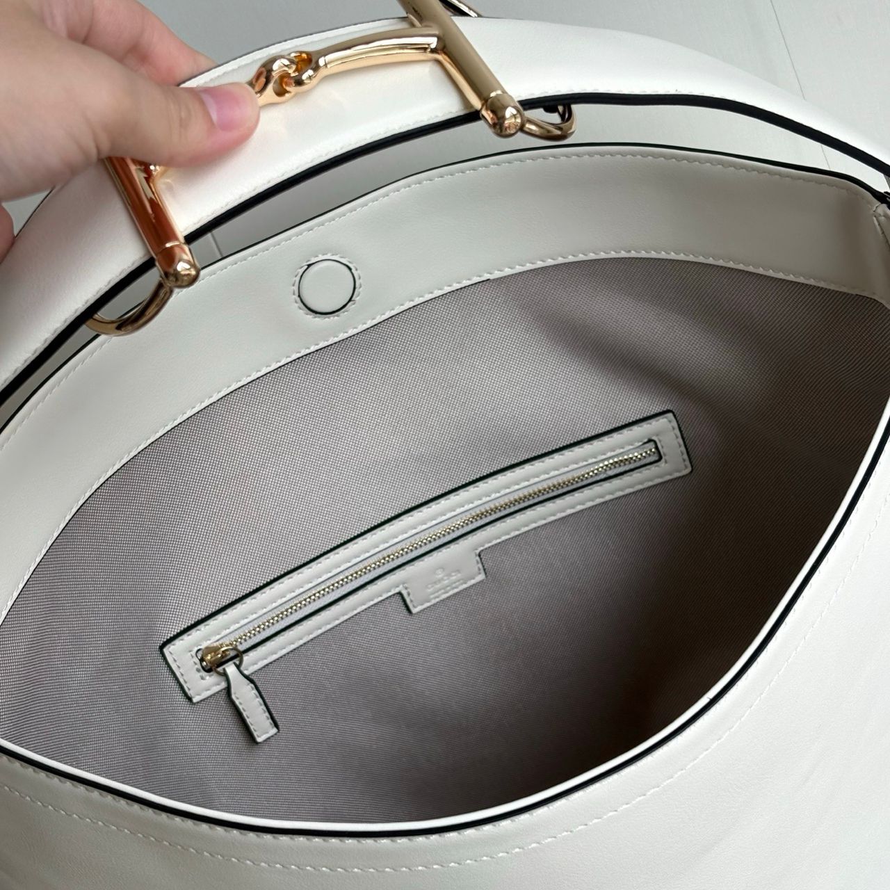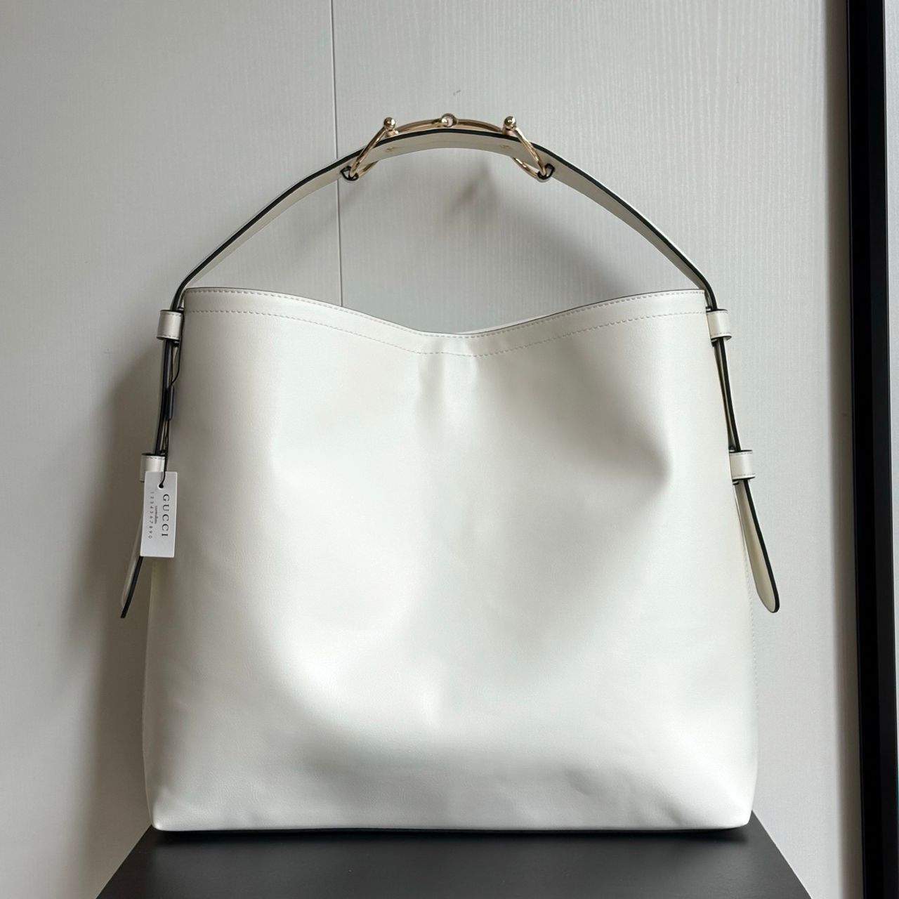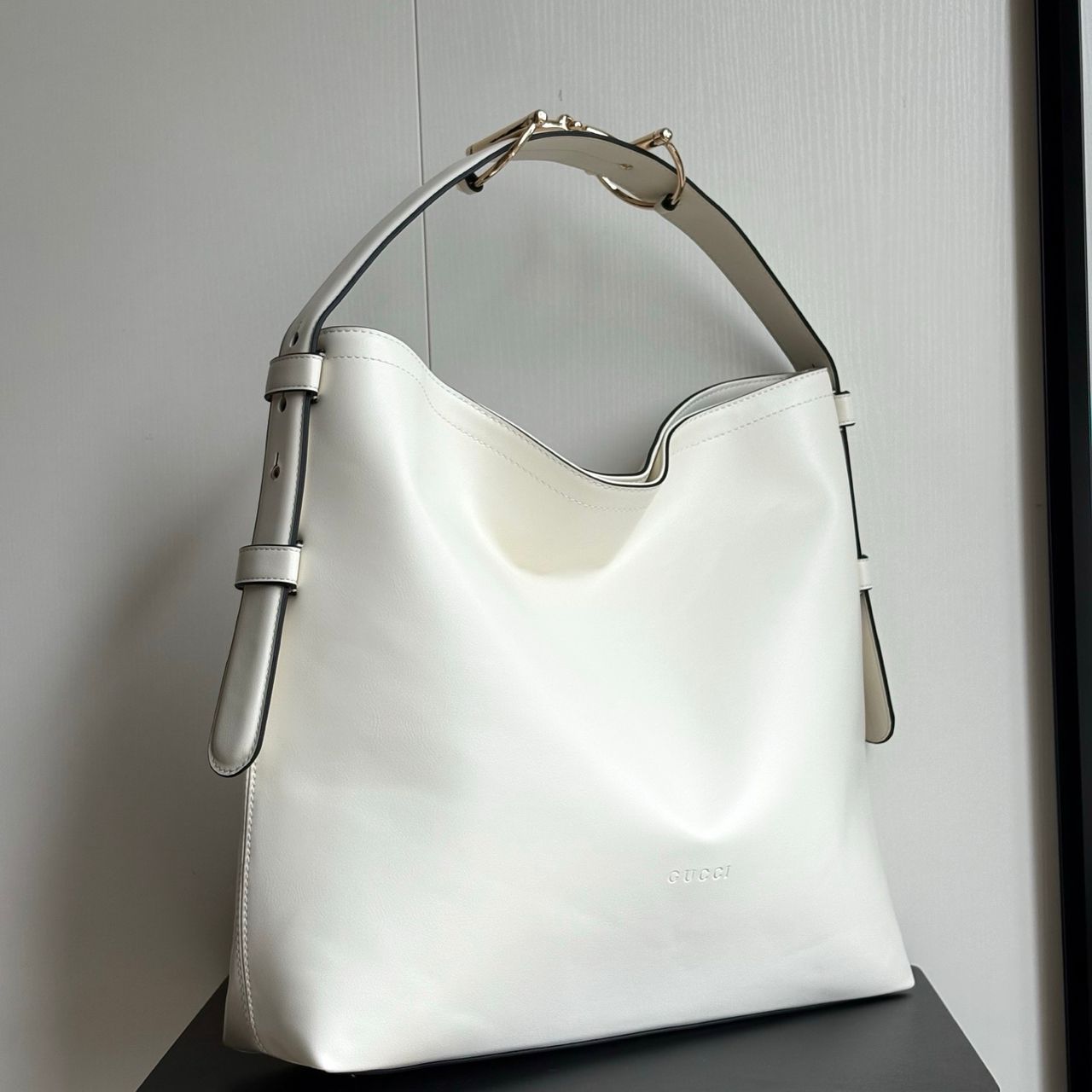 - Horsebit detail on the shoulder strap