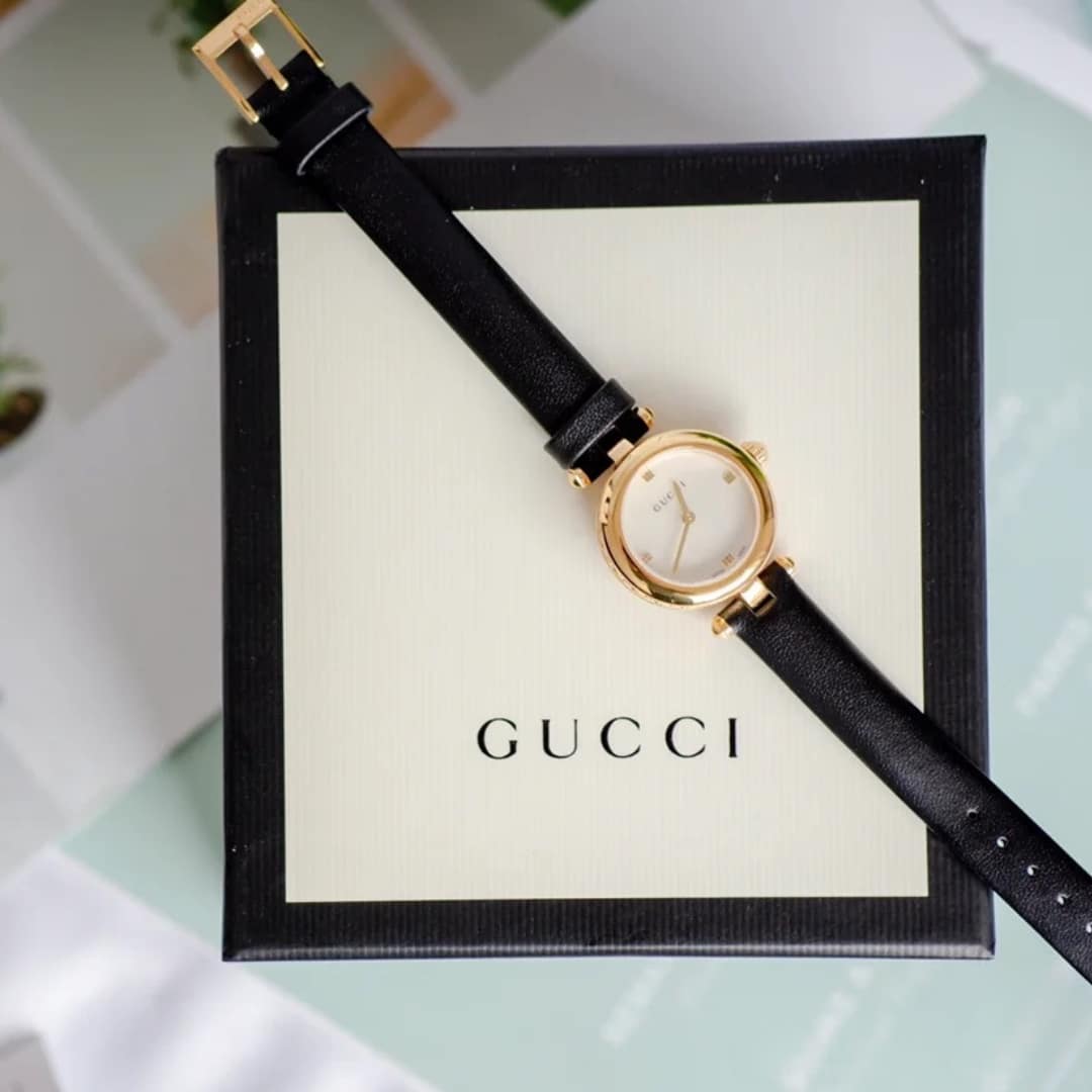 Gucci Diamantissima Steel Watch With Black Leather Strap 27Mm Ya141505