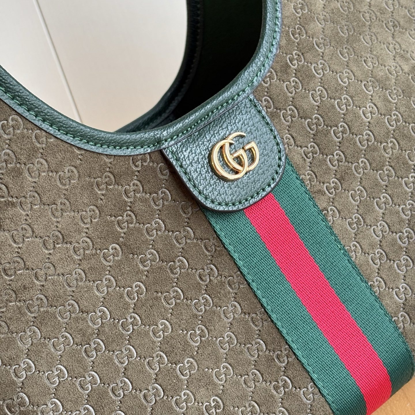 The Gucci Giglio Small Tote Bag in dark green that debuted as part of the Cruise 2026 collection. Crafted from GG canvas with dark green leather trim, this sculptural bag features iconic green and red Web stripes and light gold-toned hardware. The functional design includes a hidden magnetic closure, a detachable interior pouch, and an adjustable leather shoulder strap for effortless transition between a top handle and a crossbody carry.