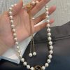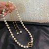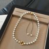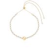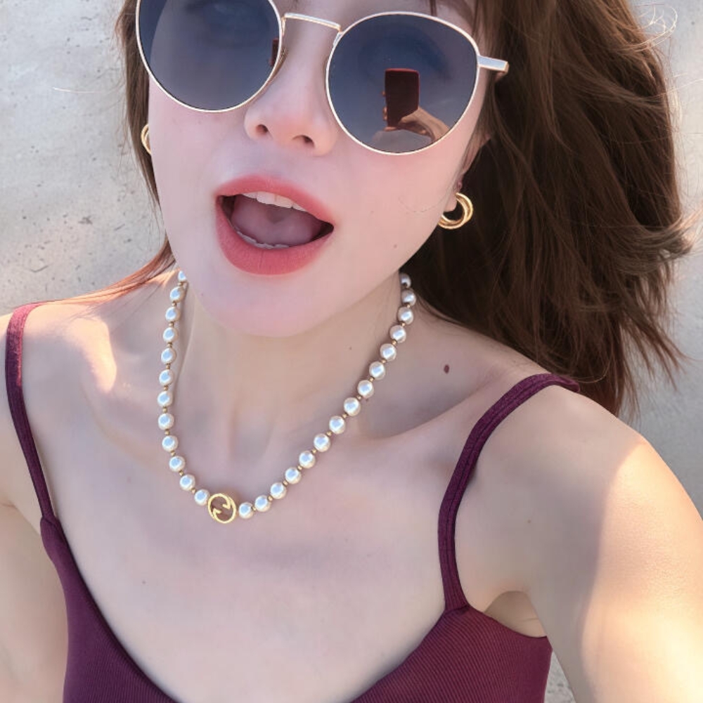 A Round Interlocking G pendant detail is accompanied by a new pearl boule chain to define this necklace. A matching bracelet and longer necklace design feature the same easy sliding closure with a push button.