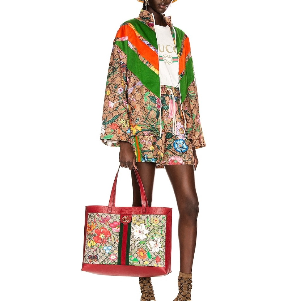 The Gucci Ophidia GG Flora Medium Tote in Dark Red blends classic GG Supreme canvas with the vibrant Flora print for a striking look. Accented with red leather trim and the iconic Web stripe, this spacious tote offers timeless elegance and practicality. Ideal for making a bold yet sophisticated statement.