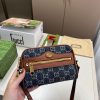 This is a Gucci Denim GG Monogram Mini Ophidia Shoulder Bag in Blue and Tea Cuir Epilog. This camera-style crossbody bag is crafted of Gucci GG denim monogram coated canvas, with brown leather trim. The crossbody bag has an adjustable strap to make sure it fits you perfectly