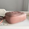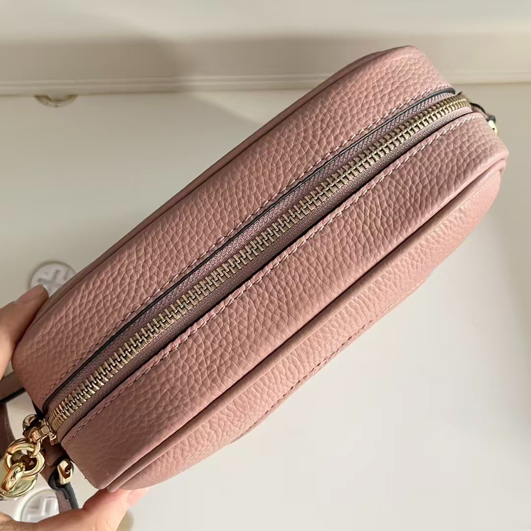 The Gucci Soho Small Disco Bag in pink is the perfect blend of minimalist style and Italian luxury, expertly crafted from premium grained leather featuring the iconic embossed interlocking GG logo. This bag offers ideal storage for your daily essentials and is accented by a stylish leather tassel on the zipper pull. The adjustable shoulder strap provides versatile carrying options, allowing you to effortlessly transition from a dynamic crossbody to an elegant shoulder look.