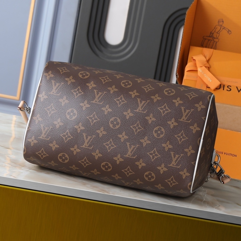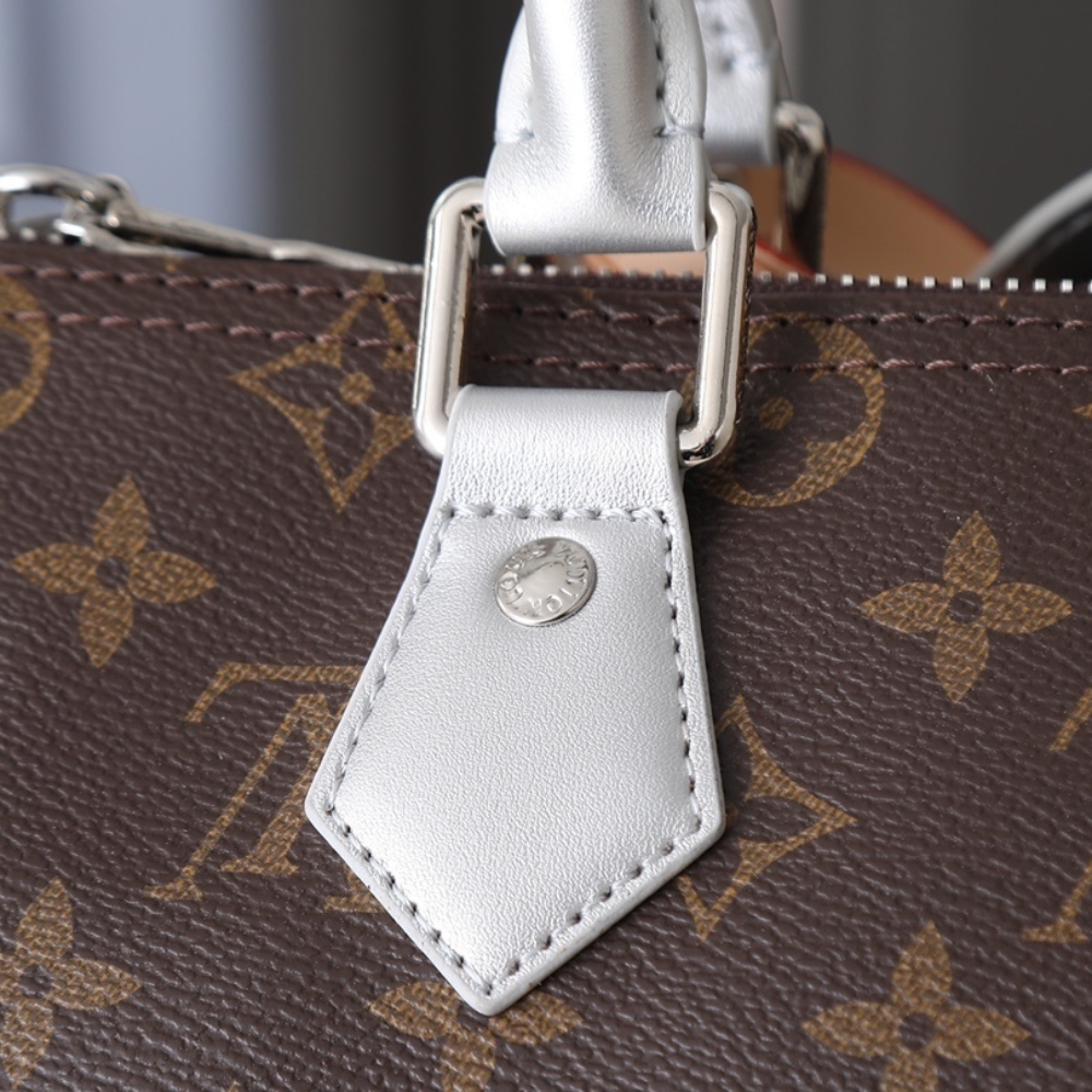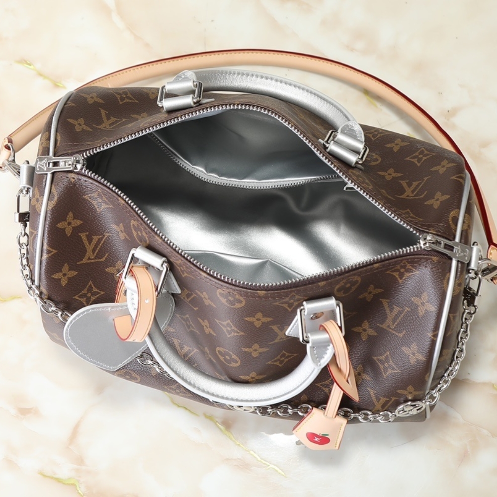 The Speedy Bandoulière 30 is reinvented for the season in this Silver Skyline edition to honor New York City. Crafted from the House’s iconic Monogram canvas, it has metallic leather trims and a removable chain, which is playfully adorned with ice cube-shaped charms. This playful iteration also includes a heart-shaped name tag and keybell, and is fitted with a zipped pocket on the inside to keep small valuables secure.