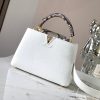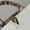 It was on the Rue des Capucines in Paris that the first Louis Vuitton store opened its doors. As timeless as the House itself, the Capucines bag brings chic sophistication to any look. Full-grain leather combines with python to create a luxurious handbag accented with heritage details: the LV initials, the distinctive side rings and the subtle Monogram flower on the closing flap.