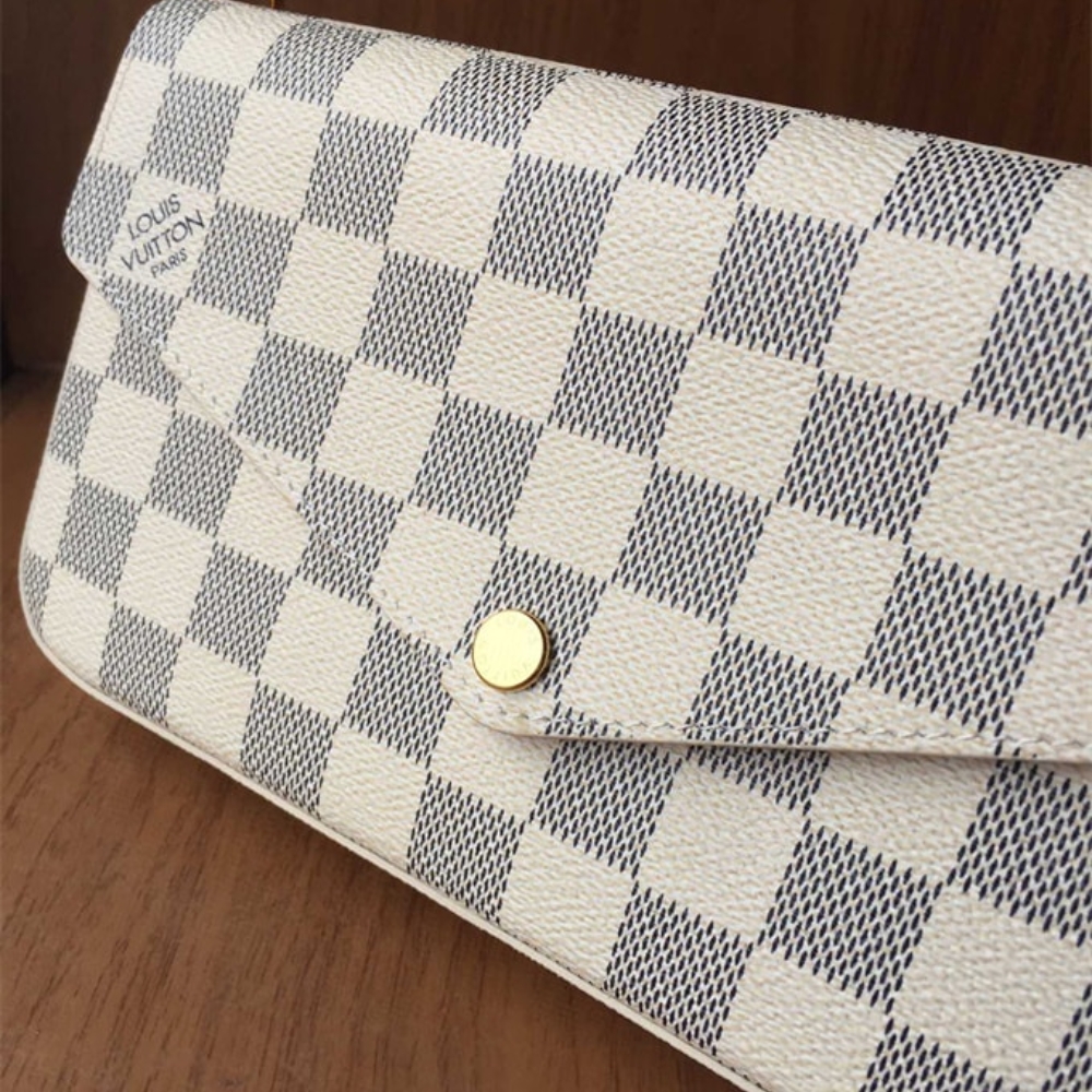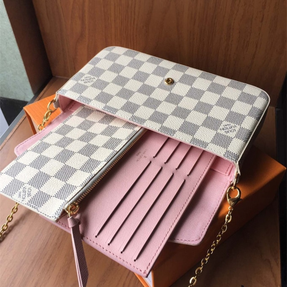 The versatile Félicie Pochette, made from Damier Azur canvas, is perfect for a modern lifestyle. Its envelope-like design features a flap that, when opened, reveals a spacious compartment with two removable pockets. One is zippered, while the other features multiple card slots. This bag can be carried on the shoulder or cross-body using the chain. It can also be used as a clutch by removing the chain.