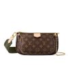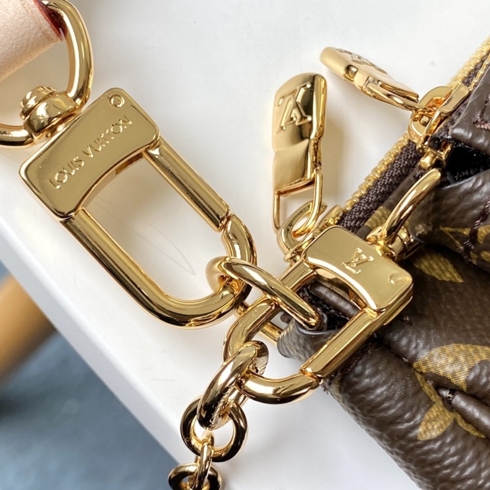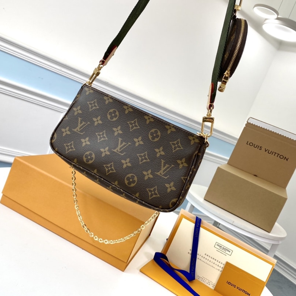 The Multi Pochette Accessoires is a hybrid cross-body bag with multiple pockets and compartments that brings together a Pochette Accessoires, a Mini Pochette Accessoires and a Round Coin Purse. Fashioned from Monogram canvas with a mini Monogram pattern on the sides of the two pochettes, it has both a removable gold-tone chain and an adjustable Louis Vuitton inscribed Jacquard strap for multiple carrying options.