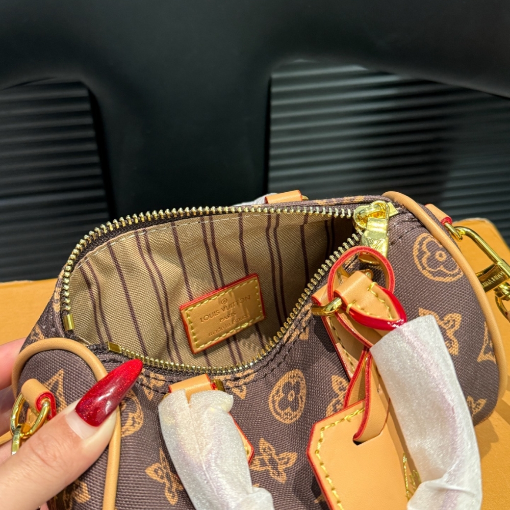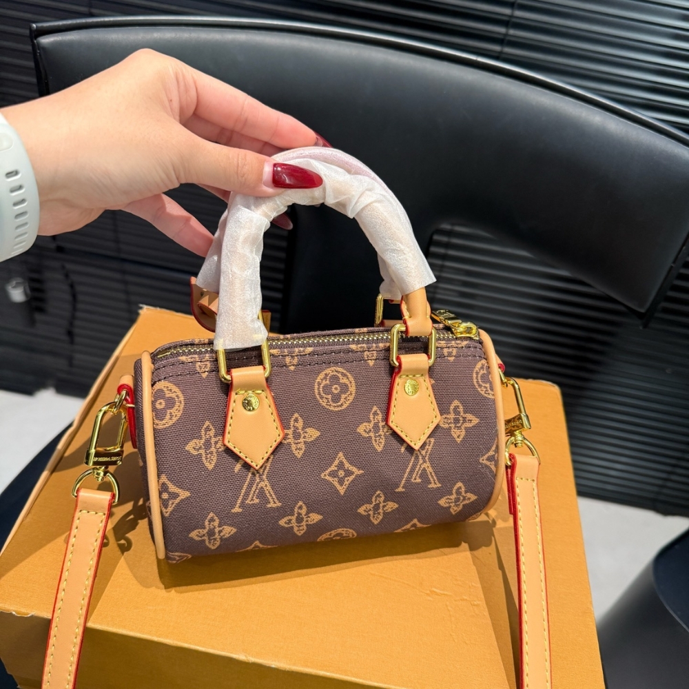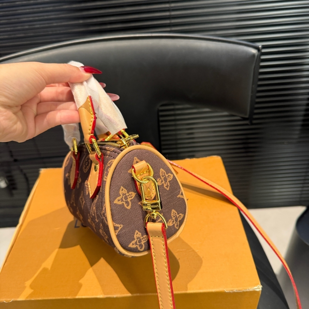 The iconic Nano Speedy is reimagined in Monogram Origine canvas to celebrate the 130-year anniversary of the House’s emblematic pattern. This elegant edition is adorned with gold-toned hardware and includes a unique label that is exclusive to the celebratory collection. It can be carried by hand or styled with the removable strap, and is sized to fit daily essentials, including a small wallet.