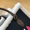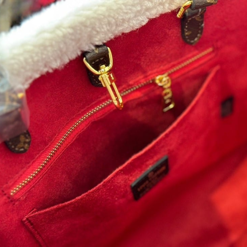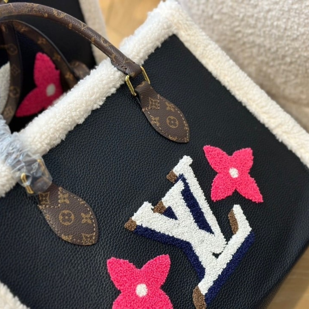 This Louis Vuitton Onthego bag features a bold embroidered LV logo design, accented with Monogram leather handles and cozy shearling trim for a standout winter-ready look. Crafted with a structured silhouette and spacious interior, it’s perfect for daily use while making a strong luxury statement. A unique designer handbag that blends comfort, functionality, and iconic Louis Vuitton style.