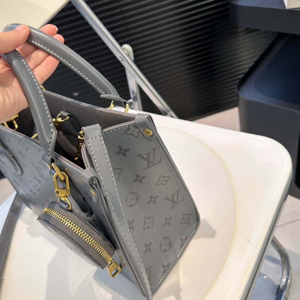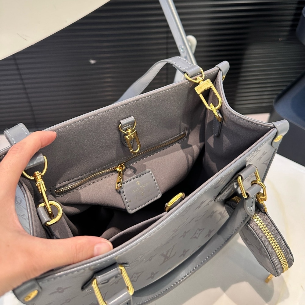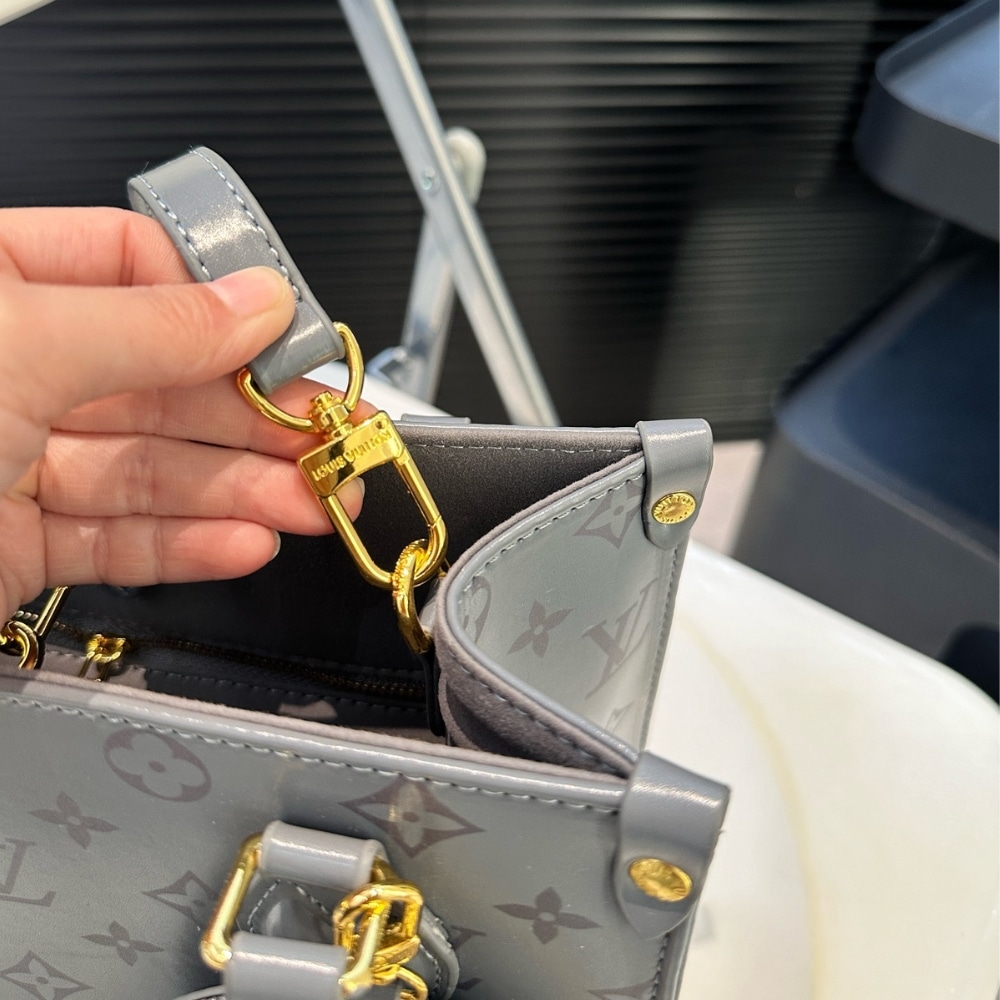 Part of the Monogram Ink lineup, the OnTheGo PM offers a matte, tone-on-tone finish in seasonal Trianon gray. It is crafted from smooth leather, elevated with four riveted corner tabs that nod to the House’s iconic vintage trunks. The smart interior is well-organized, and includes a large zipped pocket for bills and notes.