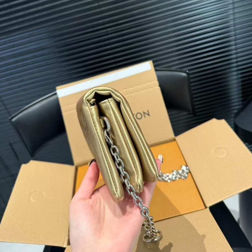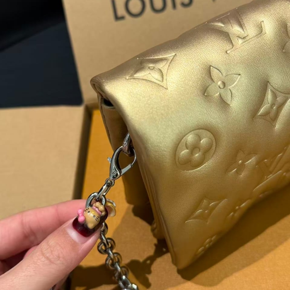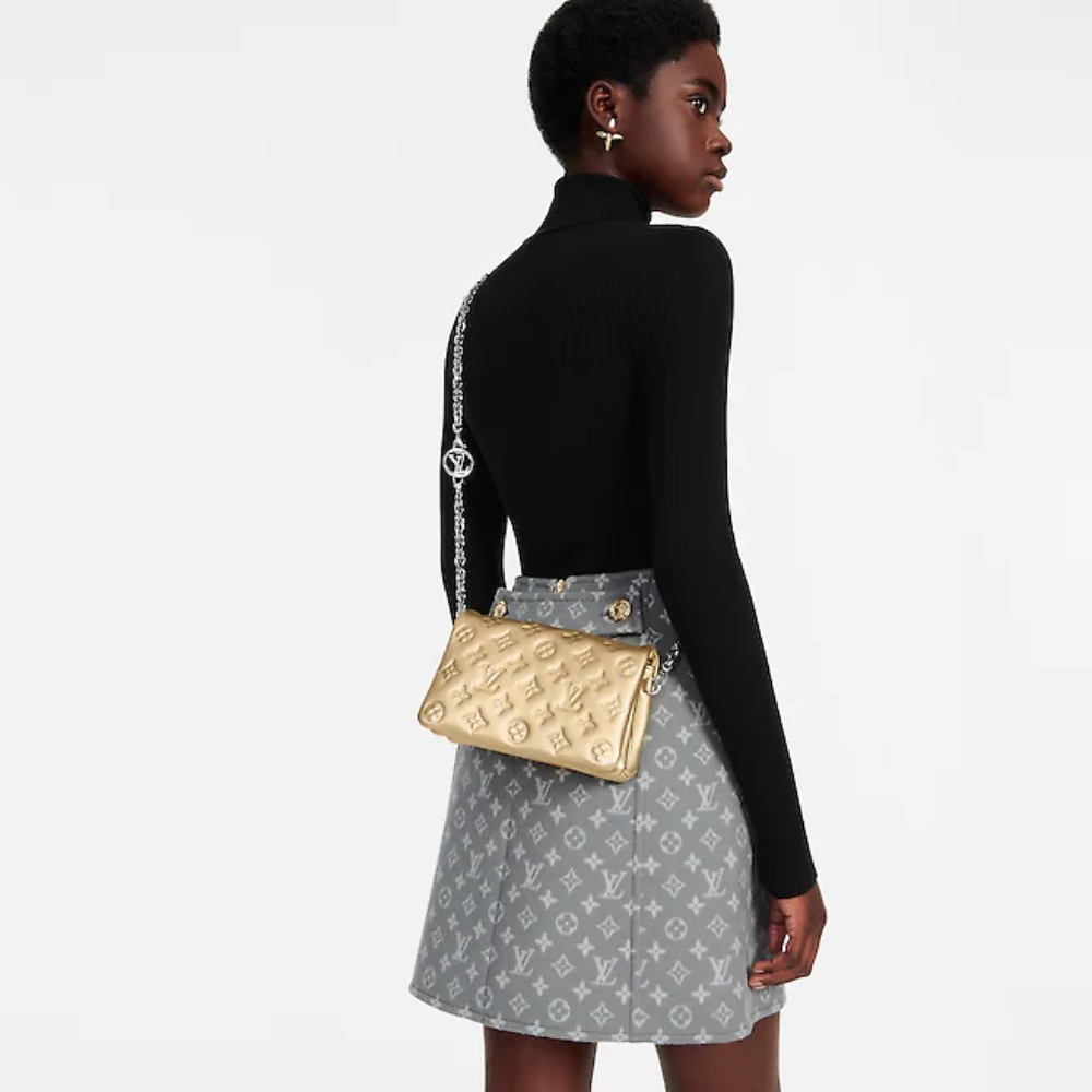 The Pochette Coussin is crafted from soft leather, which is embossed with the Monogram pattern to create a puffy, cushiony effect. This is further enhanced by the construction of the pouch, which gives it a supple, body-friendly shape. The removable chain, decorated with a Louis Vuitton charm, offers different carry options: clutch, shoulder or belt.