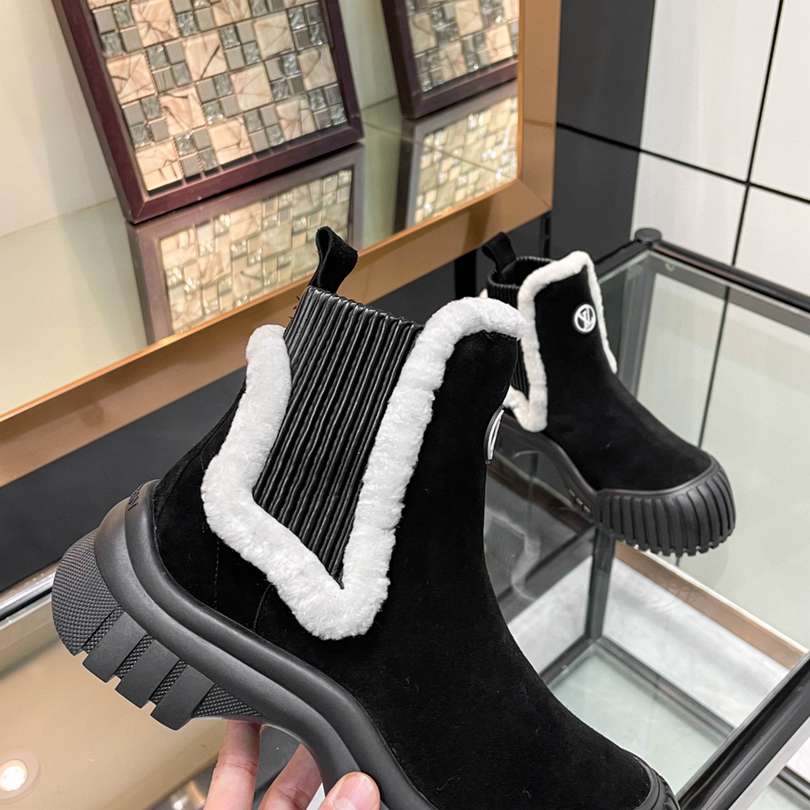 The Ruby flat ankle boot is made of suede leather with shearling details. This fashion-forward interpretation of a Chelsea boot comes on a chunky yet lightweight rubber outsole with distinctive grooved details and a contrasting Louis Vuitton signature. A leather back loop and elastic side panels ensure easy fitting. The model is finished by a rubber LV Circle signature.