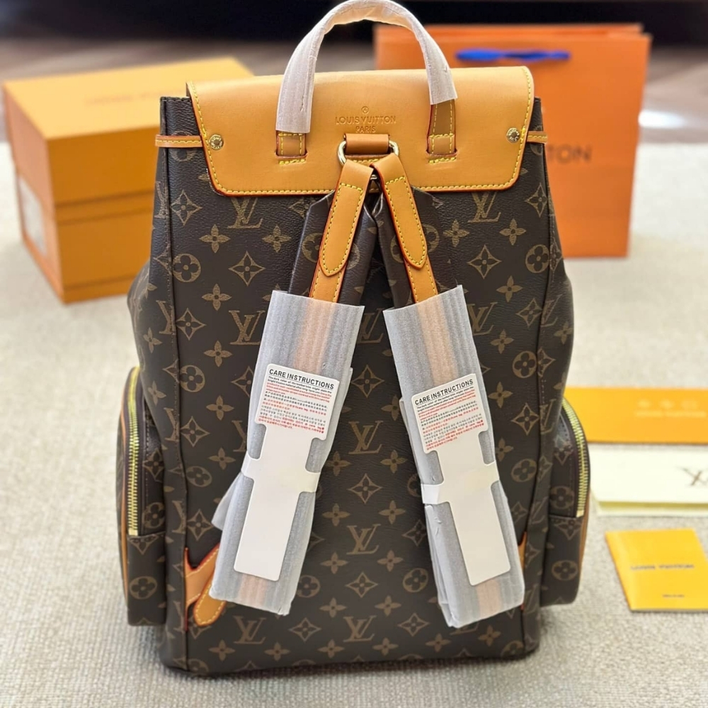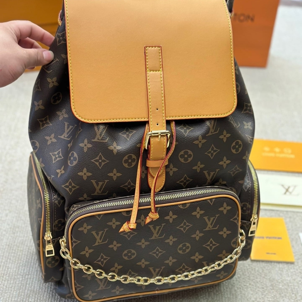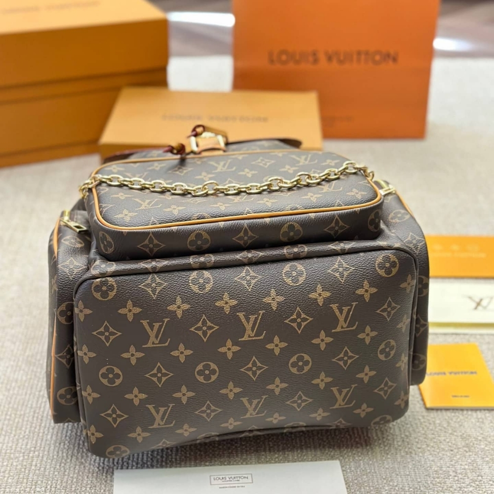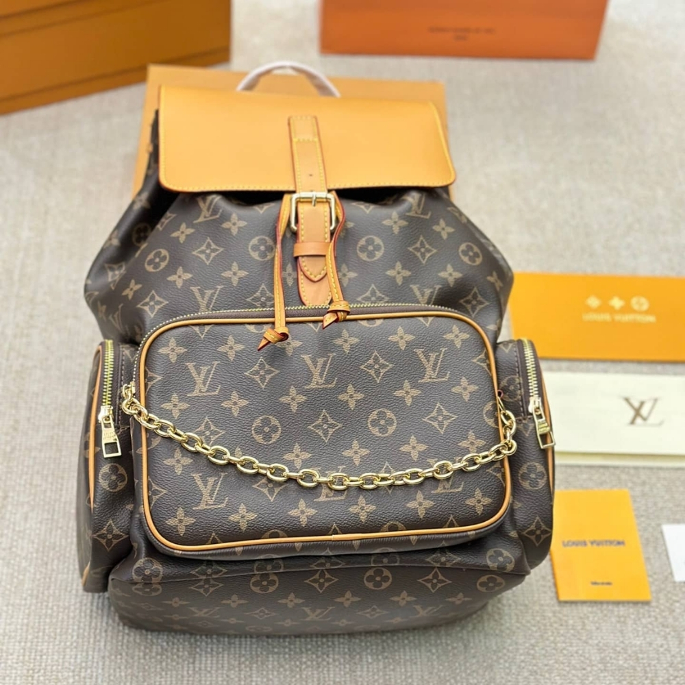 The Louis Vuitton Trio Backpack is a stylish and functional. It features a large main compartment with a secure flap and buckle closure, complemented by a front zipped pocket accented with a modern gold-tone chain detail. The ergonomic design comfortable adjustable straps, making it a perfect high-capacity choice for travel or urban adventures.
