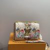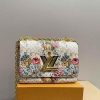 It features a delicate floral print design with the iconic LV twist-lock closure in gold-tone metal. The bag is finished with a slim gold chain strap, allowing it to be worn on the shoulder or crossbody. With its compact 23 cm size, this elegant piece is perfect for evening events, special occasions, or adding a romantic touch to a stylish outfit.