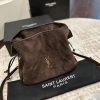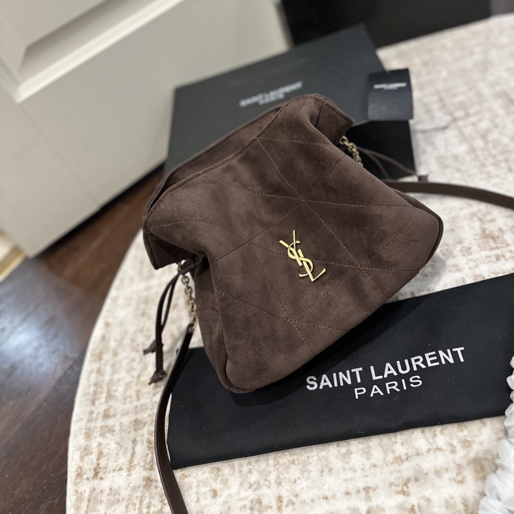 The shoulder pouch version of the JAMIE, decorated with the CASSANDRE and CARRÉ RIVE GAUCHE topstitching. This lightweight and compact bag features a chain strap for crossbody carry. Drawstring ties allow the sides to be cinched or expanded to create different silhouettes.