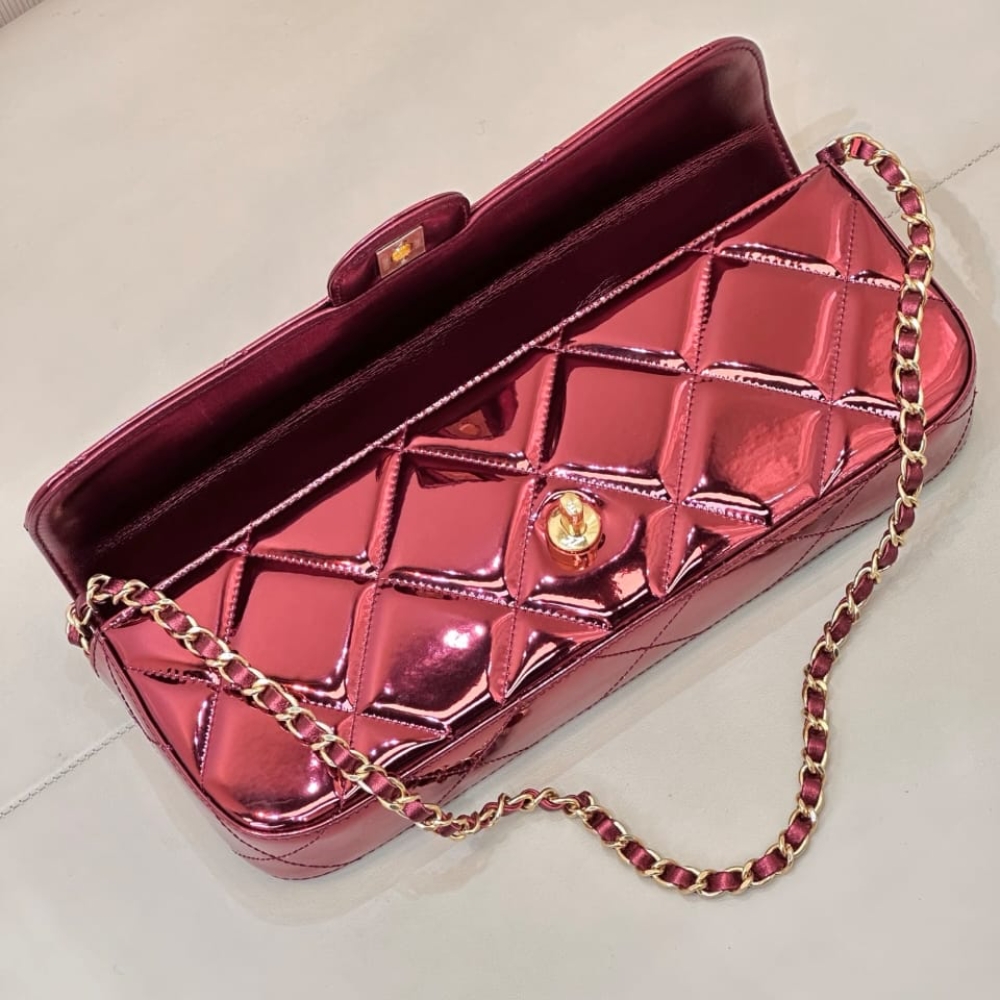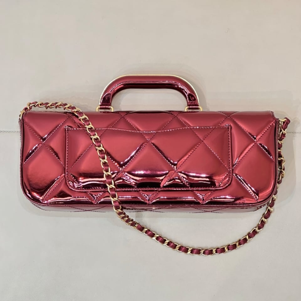 The Chanel Large Flap Bag with Top Handle in metallic mirror red features a sleek, elongated silhouette with iconic diamond quilting and a structured top handle, making it a bold statement piece for high-fashion events.