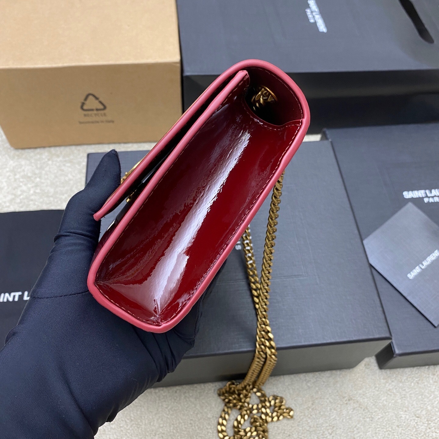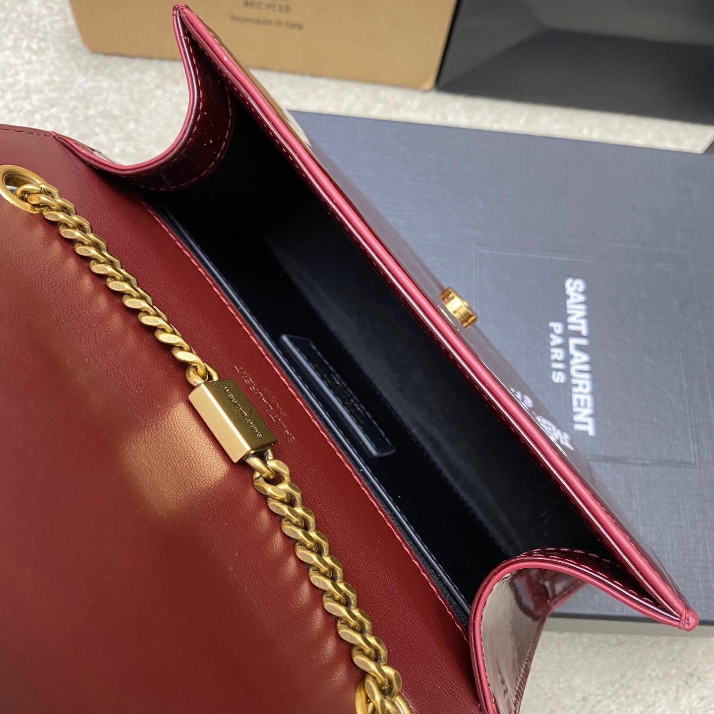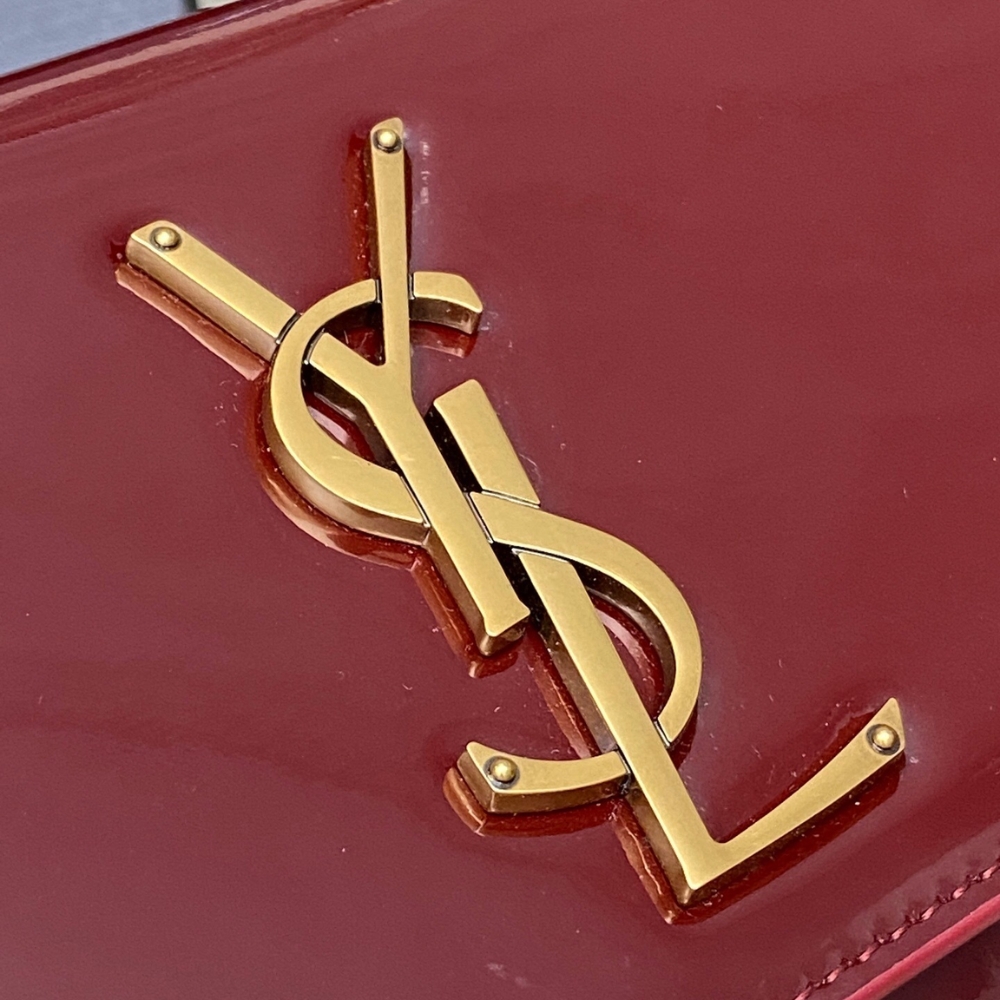 Saint Laurent Kate Red Patent Leather Shoulder Bag. Red patent leather, golden-toned hardware, front metal Cassandre logo, sliding chain shoulder strap, concealed closure, inner pocket, lined.
