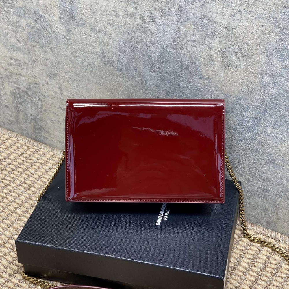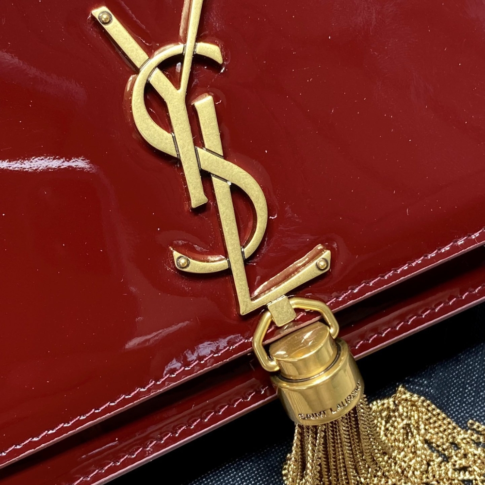 Iconic and versatile, Saint Laurent extends its infamous line with this Kate tassel chain wallet. The glossy patent leather exterior is paired with bronze-toned metal hardware showcasing the Cassandre initial hardware and tassel embellishment on the front.